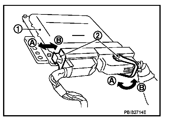 - When connecting ECM harness connector, fasten (B) it securely with a lever (2) as far as it will go as shown in the figure.