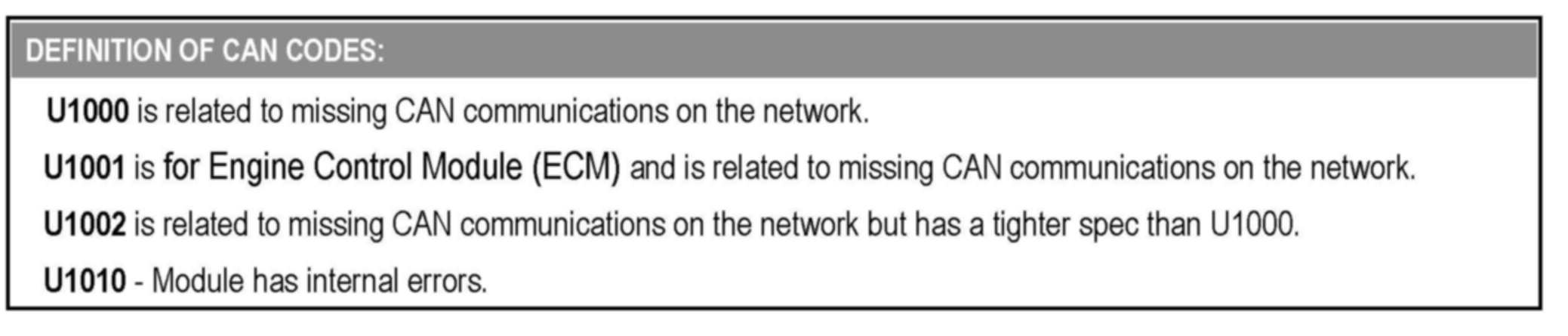 ^ When a module reports a U1000 code, it is typically operating normally; however, there is a communication error external to that module on the CAN network.