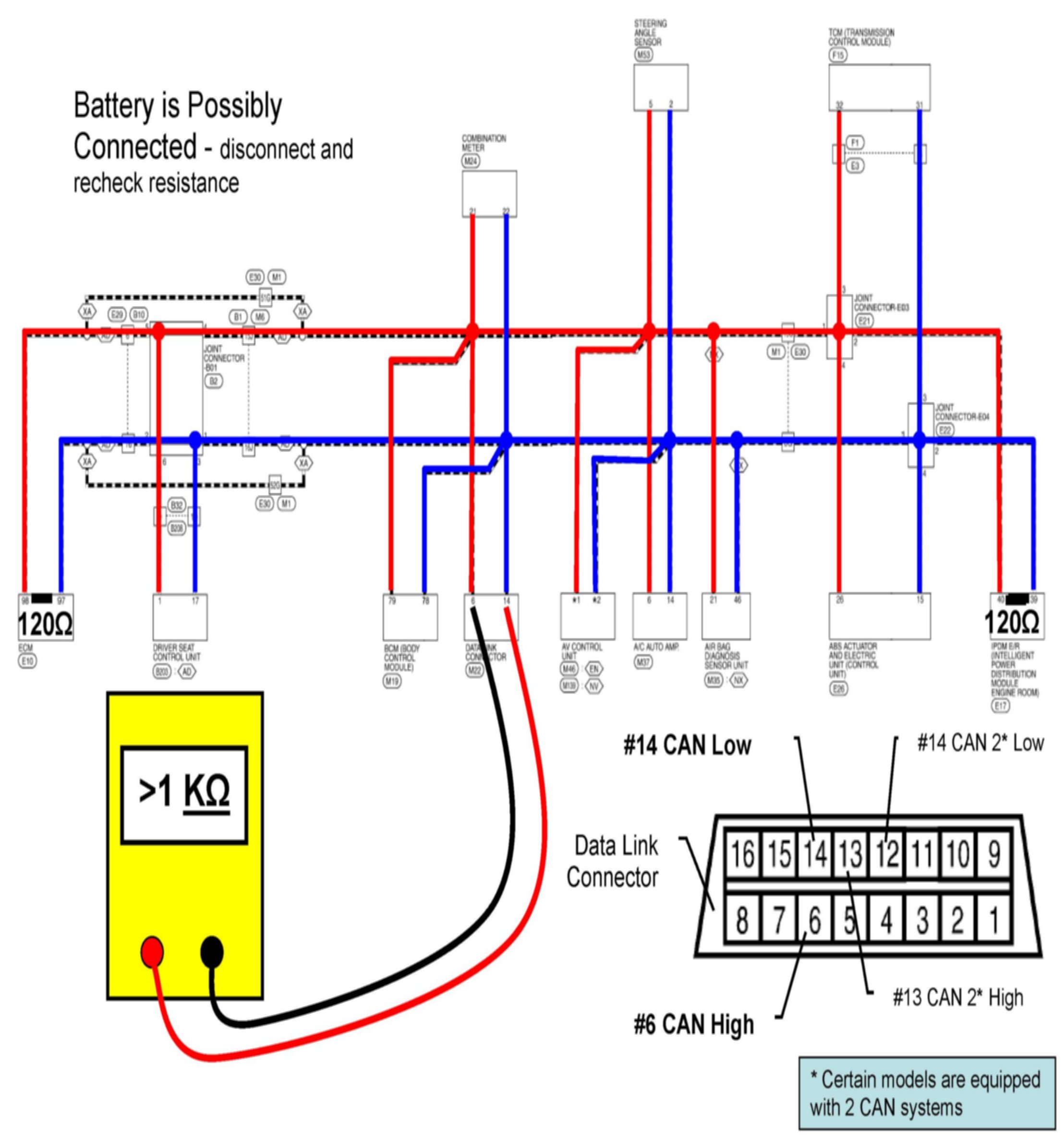 ^ Always confirm the power, ground, and CAN resistance at a suspect module before replacing the module. Resistance should be close to 60 ohms at the module (measured with the battery disconnected). The resistance at terminating modules should be close to 120 ohms. Examples of terminating modules include IPDM, ECM, or BCM. Reference the appropriate ESM to determine the terminating modules.
