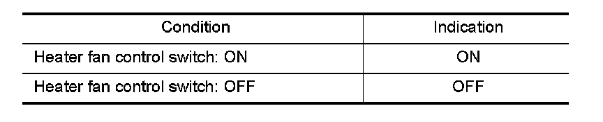 Select "HEATER FAN SW" and check indication under the following conditions.