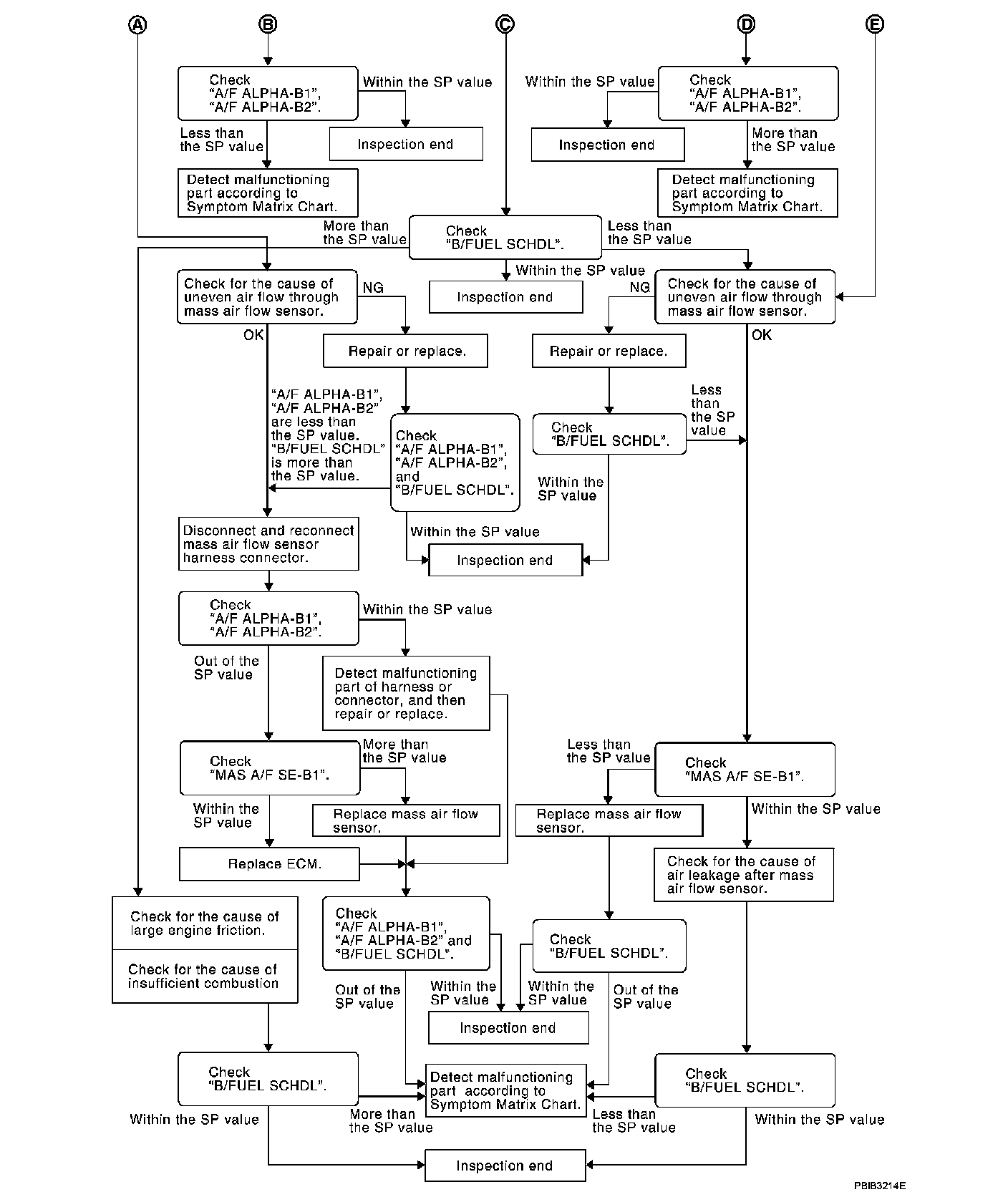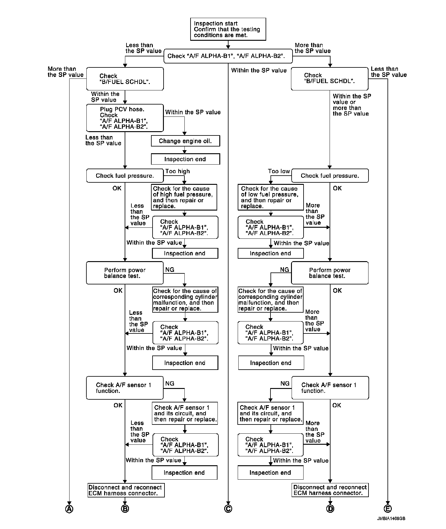 Check "A/F ALPHA-B1", "A/F ALPHA-B2" for approximately 1 minute because they may fluctuate. It is NG if the indication is out of the SP value even a little.