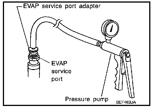 Positive pressure is delivered to the EVAP system through the EVAP service port. If fuel vapor leakage in the EVAP system occurs, use a leak detector to locate the leakage.