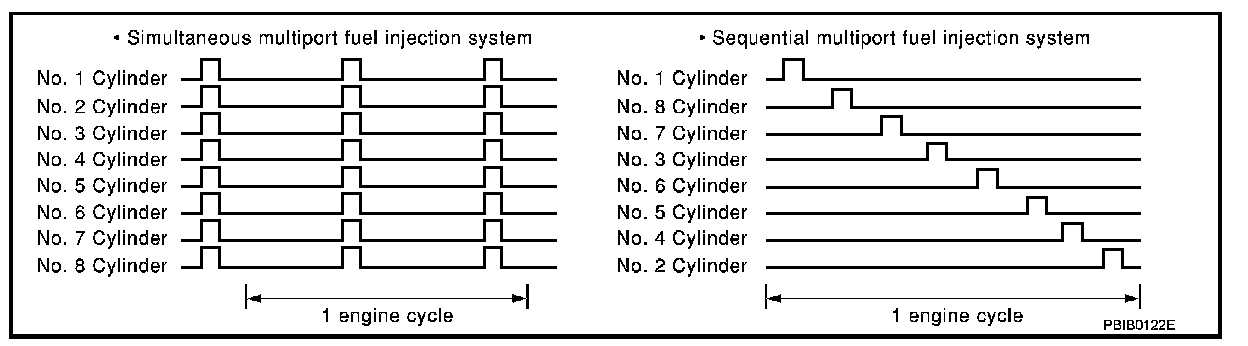 Fuel is injected simultaneously into all eight cylinders twice each engine cycle. In other words, pulse signals of the same width are simultaneously transmitted from the ECM.