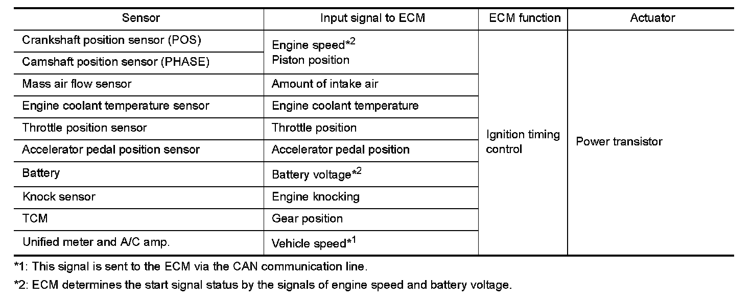 The ECM receives information such as the injection pulse width and camshaft position sensor (PHASE) signal. Computing this information, ignition signals are transmitted to the power transistor.