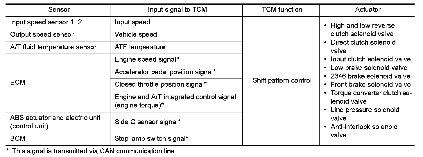 TCM receives the side G sensor signal from the ABS actuator and electric unit (control unit). It locks to 4GR, 5GR or 6GR position in moderate cornering or to 3GR position in sharp cornering based on this signal. This prevents any upshift and kickdown during cornering, maintaining smooth vehicle travel.