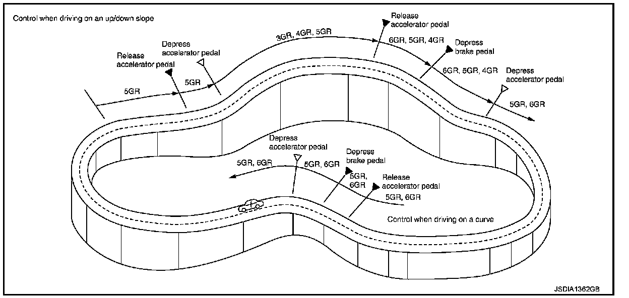 Fixing at 4GR, 5GR or 6GR on an up-slope prevents shift hunting and controls the vehicle to gain optimum driving force. On a down-slope, automatic shift-down to 4GR, 5GR or 6GR controls to gain optimum engine brake.