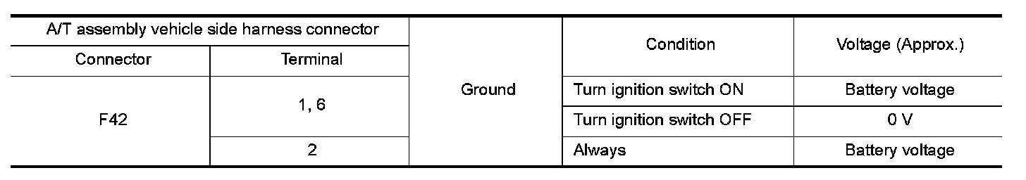 4. Check voltage between A/T assembly vehicle side harness connector terminals and ground.