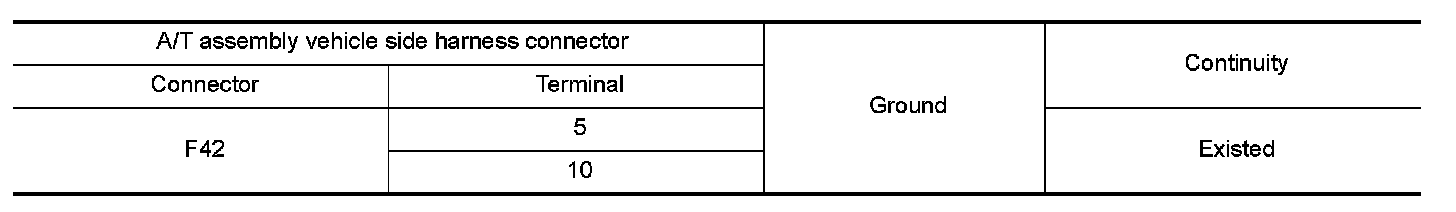 Check continuity between A/T assembly vehicle side harness connector terminals and ground.