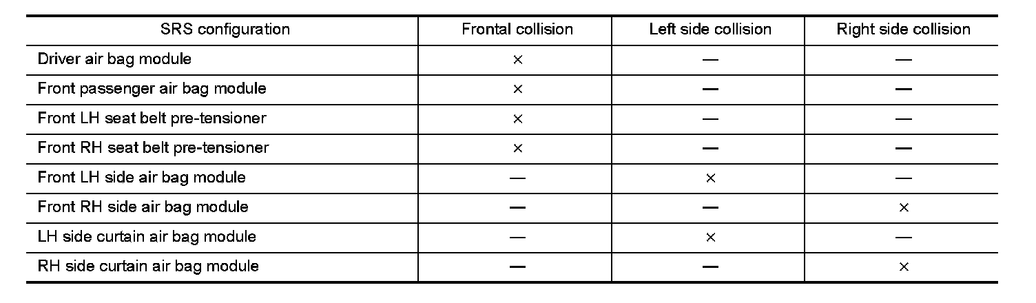 The collision modes for which supplemental restraint systems are activated are different among the SRS systems. For example, the driver air bag module and front passenger air bag module are activated in a frontal collision but not in a side collision.