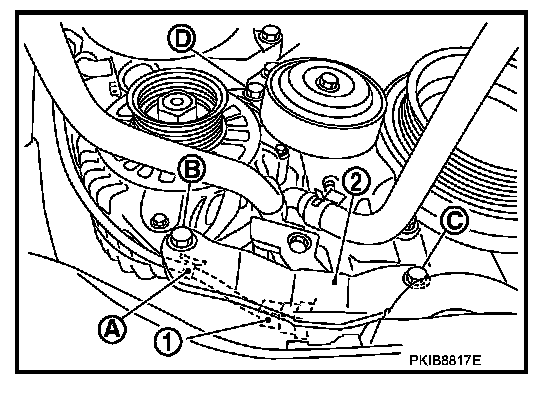 10. Remove alternator mounting bolt (D), using power tools.