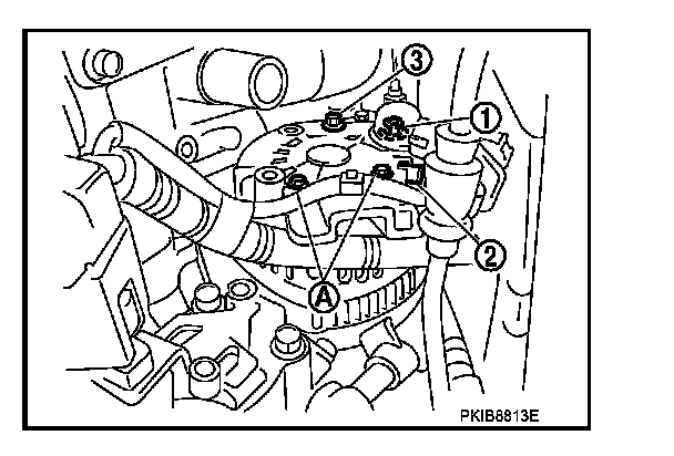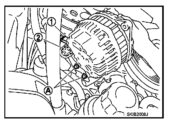 8. Pull and turn alternator, and then remove the harness bracket bolts (A).