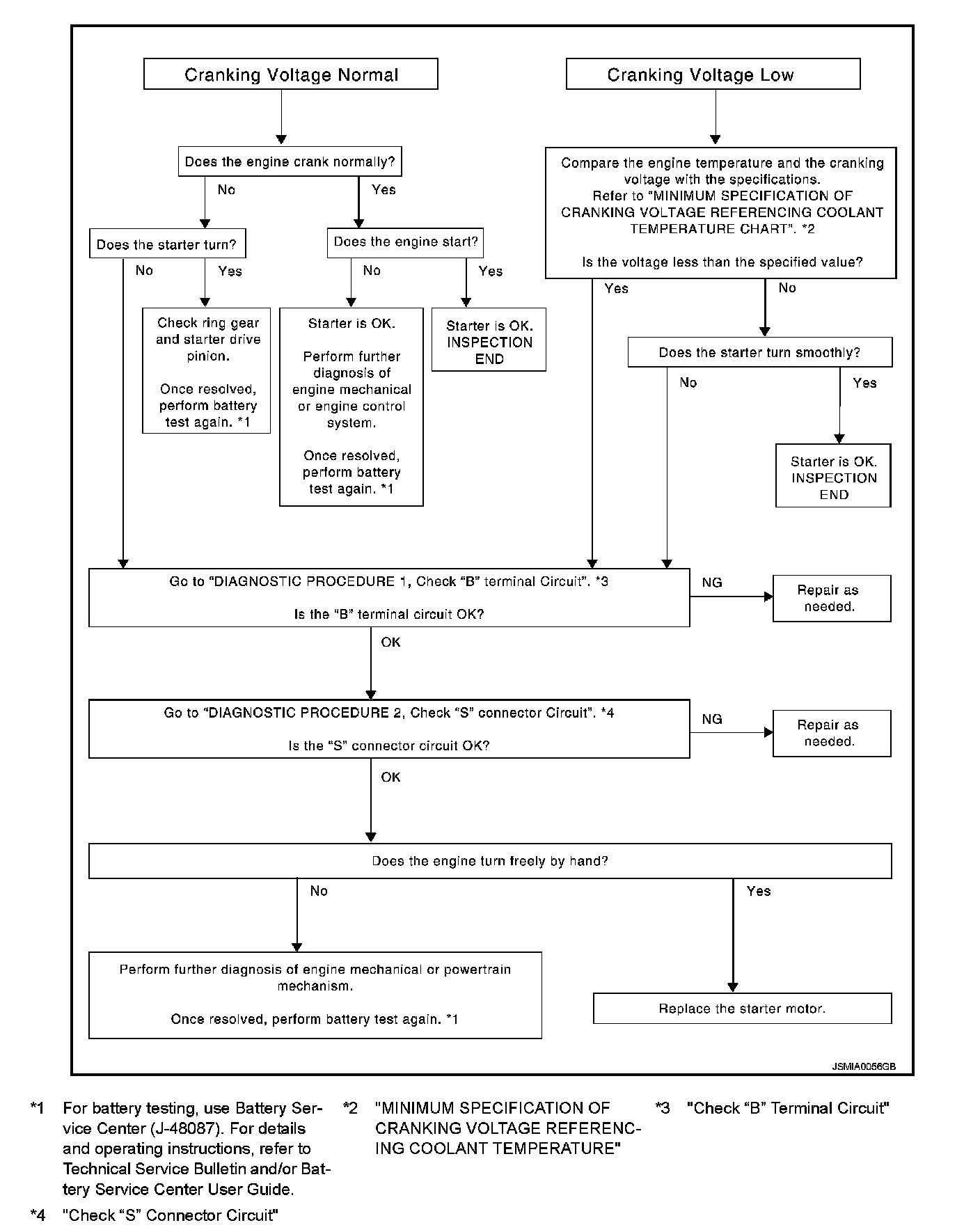 OK - "B" terminal circuit is OK. Further inspection necessary. Refer to "Trouble Diagnosis with Starting/Charging System Tester (Starting)".