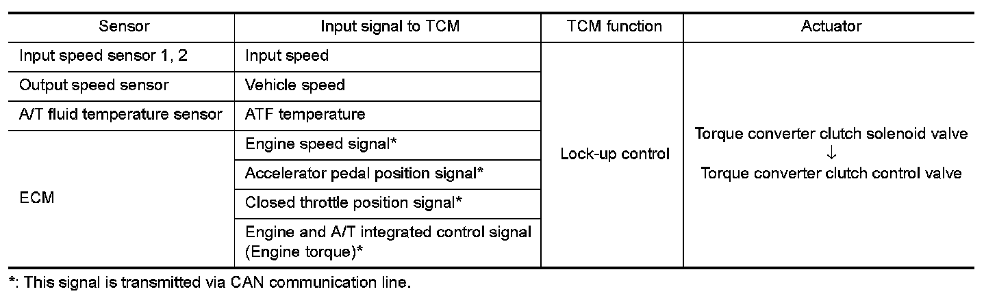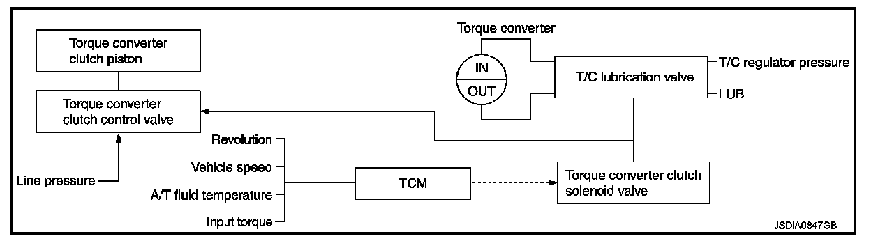 The torque converter clutch control valve operation is controlled by the torque converter clutch solenoid valve, which is controlled by a signal from TCM, and the torque converter clutch control valve engages or releases the torque converter clutch piston.