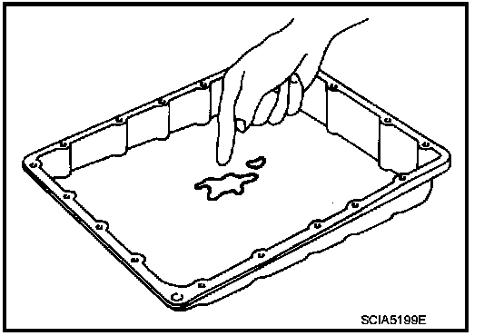 Check foreign materials in oil pan to help determine causes of malfunction. If the ATF is very dark, smells burned, or contains foreign particles, the frictional material (clutches, band) may need replacement. A tacky film that will not wipe clean indicates varnish build up.