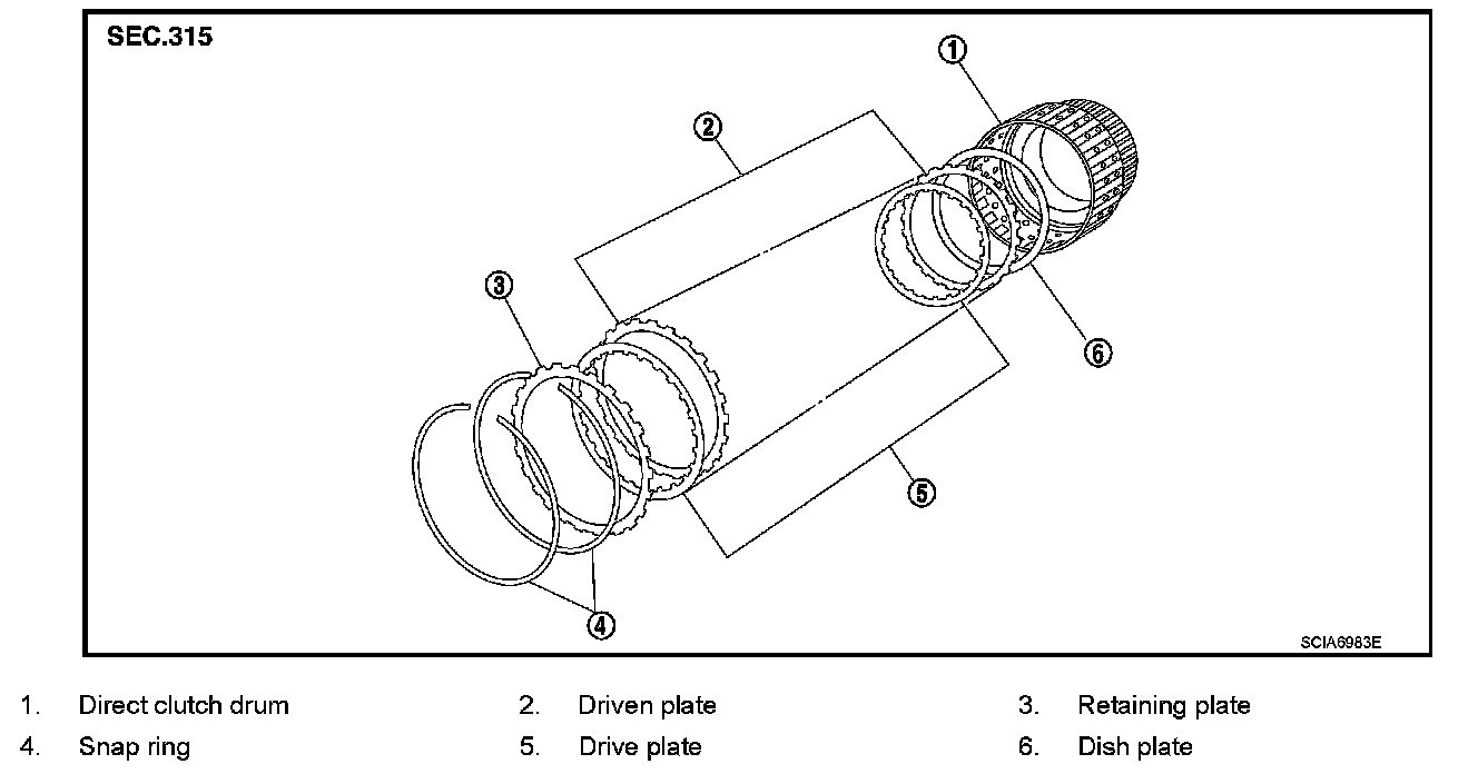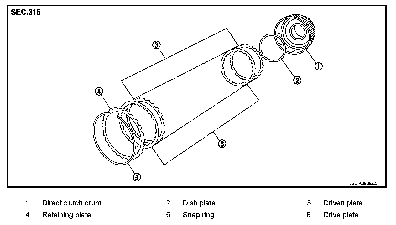 2. Remove drive plates, driven plates, dish plate and retaining plates from direct clutch drum.