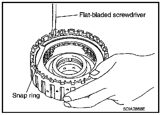 1. Using a flat-bladed screwdriver, remove snap ring from direct clutch drum.