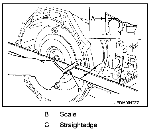 - When installing A/T assembly to the engine assembly, be sure to check dimension (A) to ensure it is within the reference value limit.