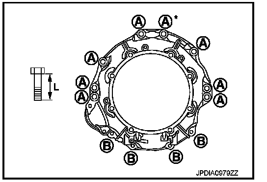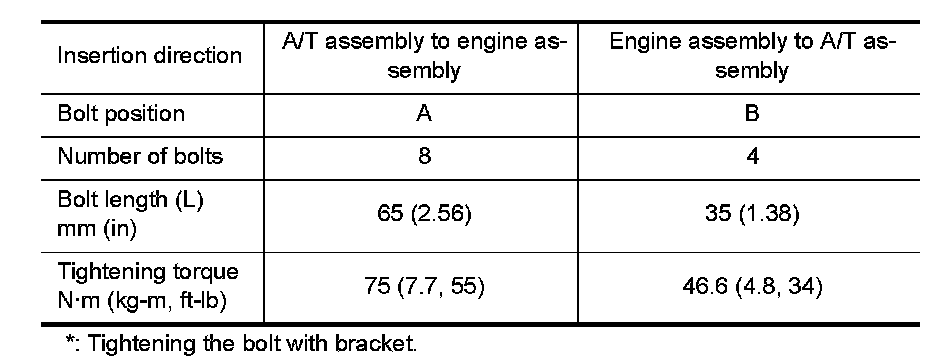 - When installing A/T assembly to the engine assembly, attach the fixing bolts in accordance with the following standard.