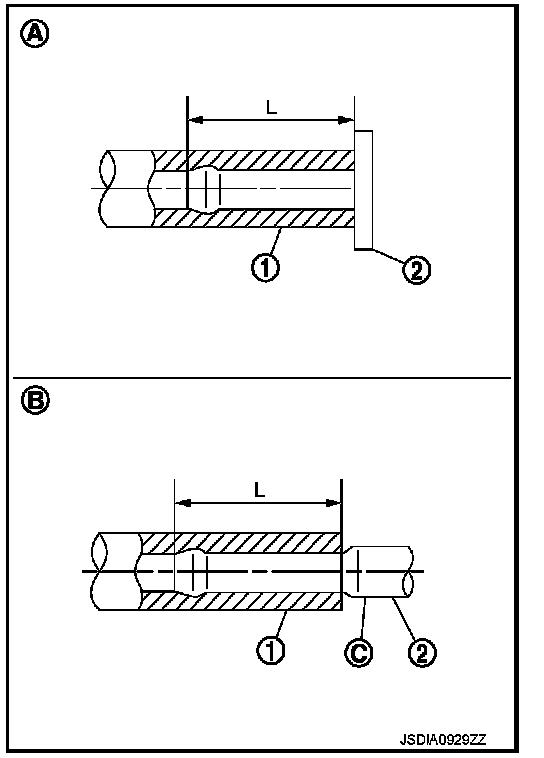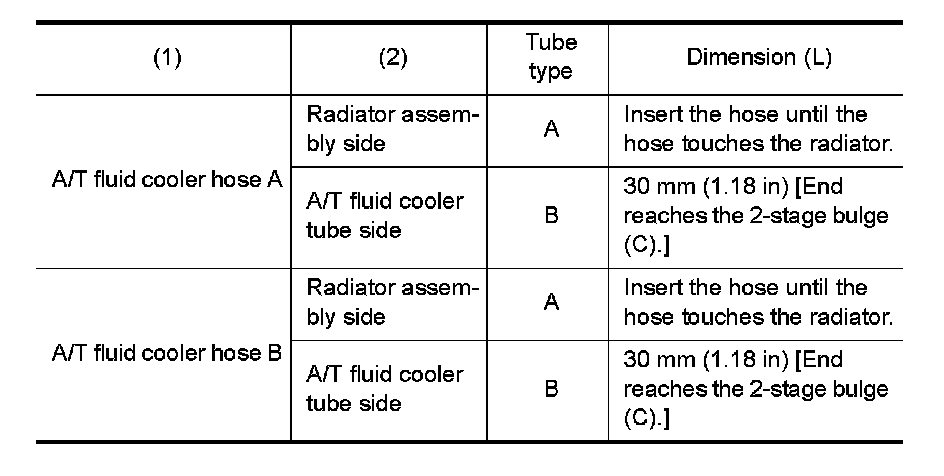 - Insert A/T fluid cooler hoses according to dimension (L) described below.