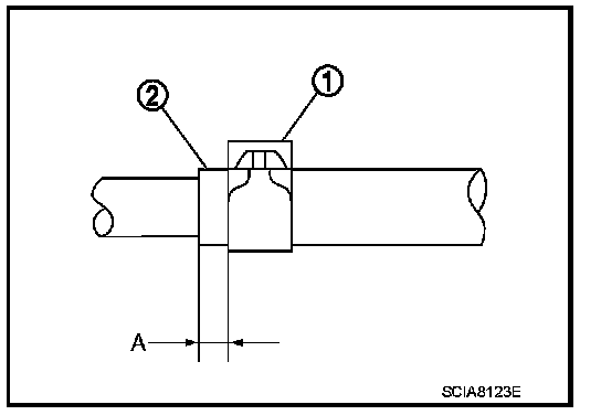 - Set hose clamps (1) at the both ends of A/T fluid cooler hoses (2) with dimension (A) from the hose edge.