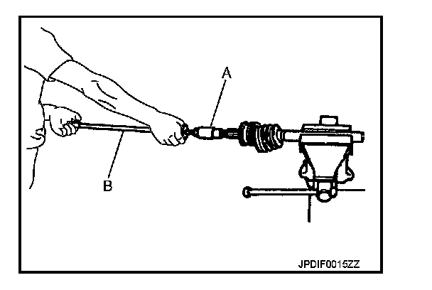 4. Screw the drive shaft puller (A) 30 mm (1.18 in) or more into the thread of joint sub-assembly, and pull joint sub-assembly with a sliding hammer (B) from shaft.