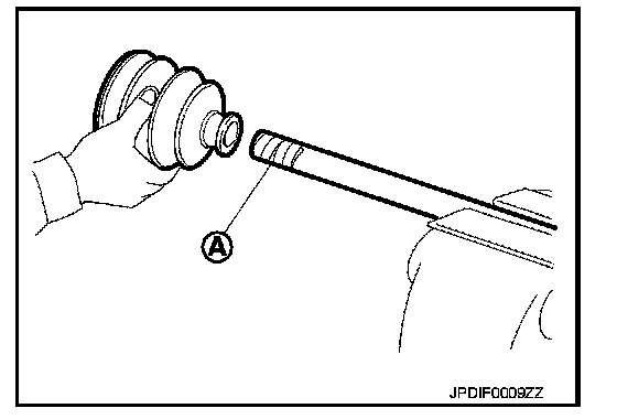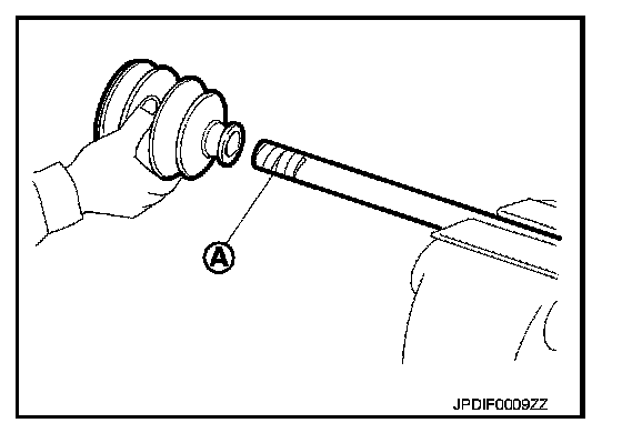 2. Wrap serrated part of shaft with tape (A). Install boot band and boot to shaft. Be careful not to damage boot.