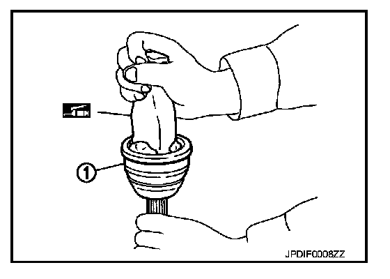1. Apply the specified amount of grease (NISSAN genuine grease or equivalent) into joint sub-assembly (1) serration hole until grease begins to ooze from ball groove and serration hole. After applying grease, use a shop cloth to wipe off old grease that has oozed out.