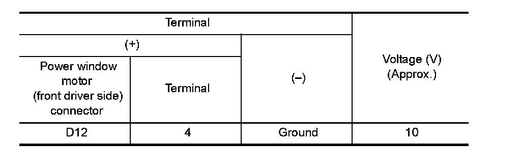 2. Check voltage between power window motor (front driver side) connector and ground.
