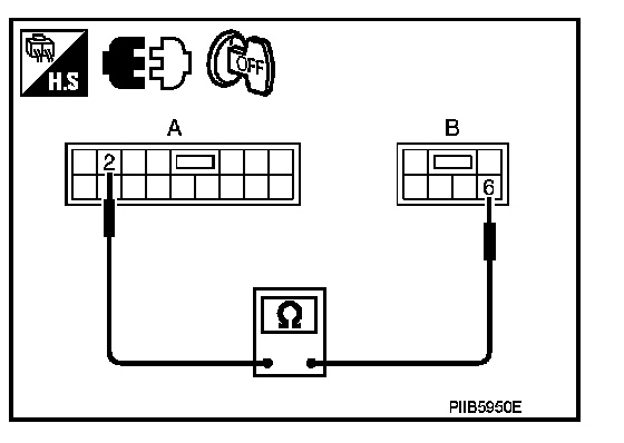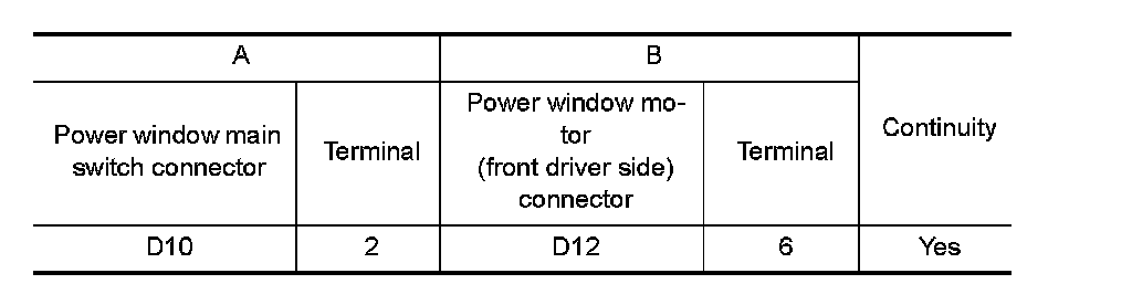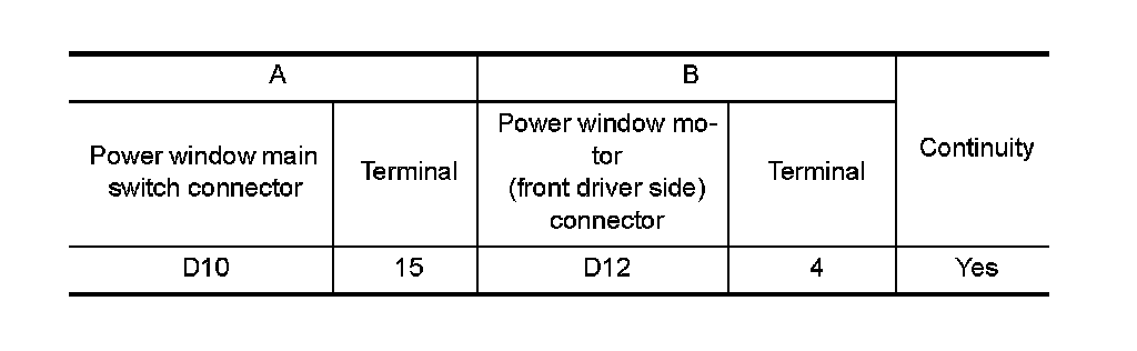 3. Check continuity between power window main switch connector and power window motor (front driver side) connector.