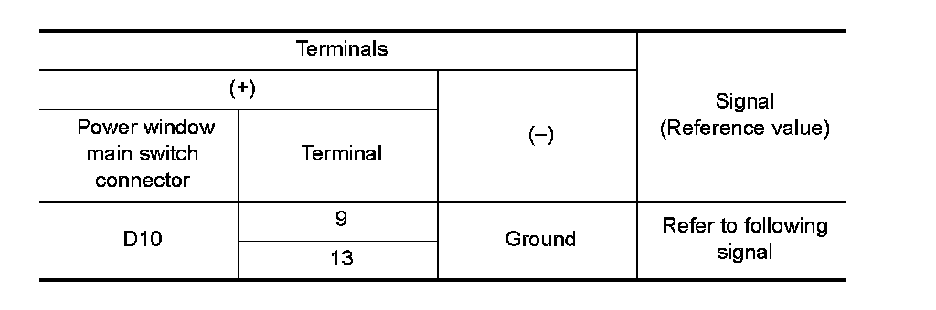 3. Check signal between power window main switch connector and ground with oscilloscope.