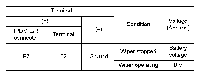 Check voltage between IPDM E/R harness connector and ground while front wiper motor is stopped and while front wiper HI is operating.