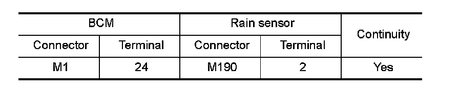 2. Check continuity between BCM harness connector and rain sensor harness connector.