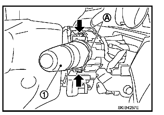 3. Pull wiper and washer switch (1) toward the passenger door while pressing pawls (A) in direction shown by the arrow in the figure, and remove it from the base.