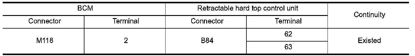 3. Check continuity between BCM harness connector and retractable hard top control unit harness connector.