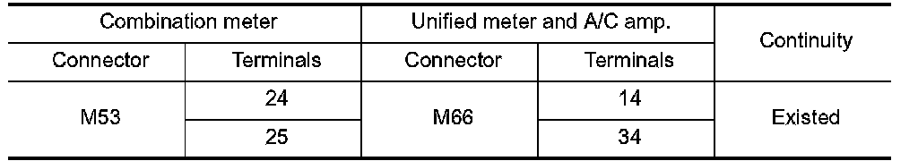3. Check continuity between combination meter harness connector terminal and unified meter and A/C amp. harness connector terminal.