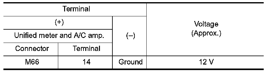 3. Check voltage between unified meter and A/C amp. harness connector terminal and ground.