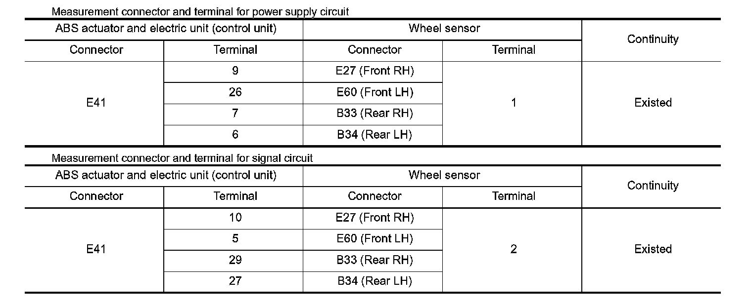 1. Check the continuity between ABS actuator and electric unit (control unit) harness connector and wheel sensor harness connector. (Also check continuity when steering wheel is turned right and left and when sensor harness inside the wheel house is moved.)