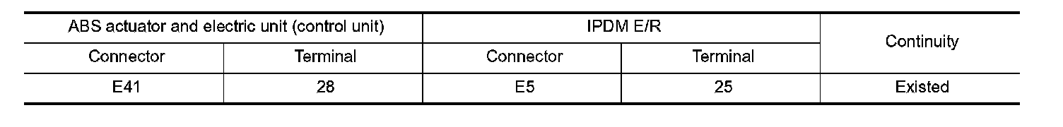 4. Check the continuity between ABS actuator and electric unit (control unit) harness connector and IPDM E/R harness connector.
