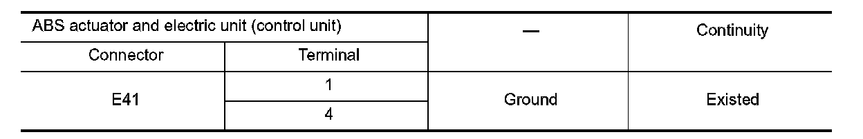 Check the continuity between ABS actuator and electric unit (control unit) harness connector and ground.