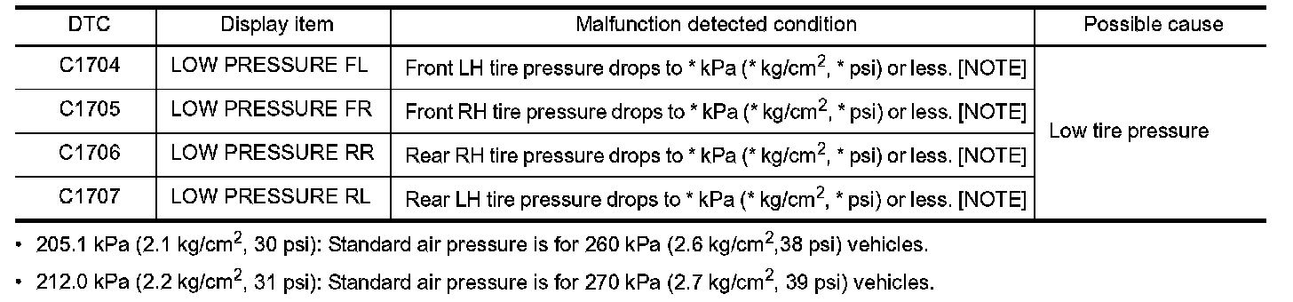 C1704, C1705, C1706, C1707 LOW TIRE PRESSURE