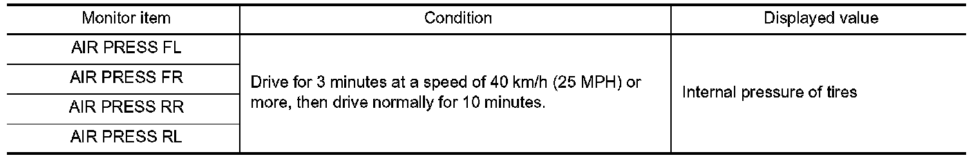 Stop the vehicle and within 5 minutes, use "DATA MONITOR" in "AIR PRESSURE MONITOR" of "BCM" to display the tire pressure for all wheels.