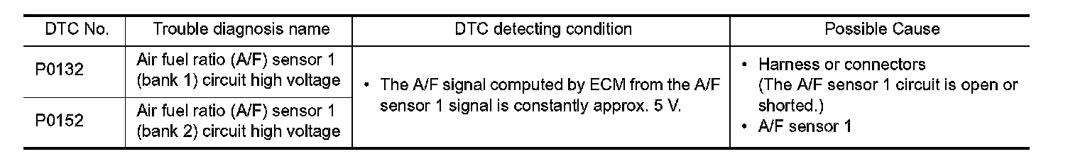 To judge the malfunction, the diagnosis checks that the A/F signal computed by ECM from the A/F sensor 1 signal is not inordinately high.