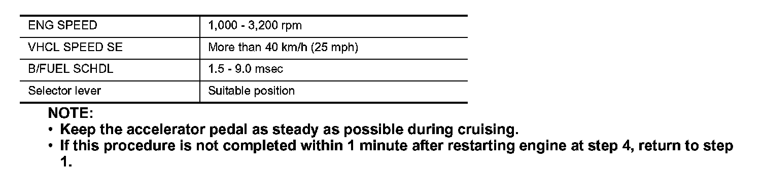 5. Drive and accelerate vehicle to more than 40 km/h (25 MPH) within 20 seconds after restarting engine.