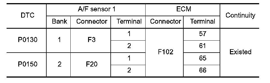 3. Check the continuity between A/F sensor 1 harness connector and ECM harness connector.