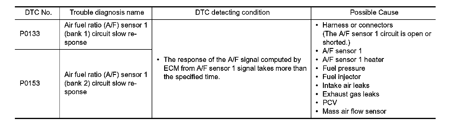 To judge malfunctions, this diagnosis measures response time of the A/F signal computed by ECM from the A/F sensor 1 signal. The time is compensated by engine operating (speed and load), fuel feedback control constant, and the A/F sensor 1 temperature index. Judgment is based on whether the compensated time (the A/F signal cycling time index) is inordinately long or not.