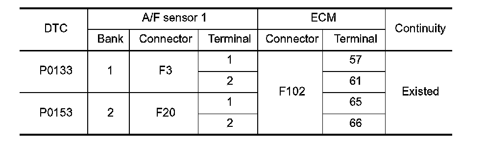 3. Check the continuity between A/F sensor 1 harness connector and ECM harness connector.