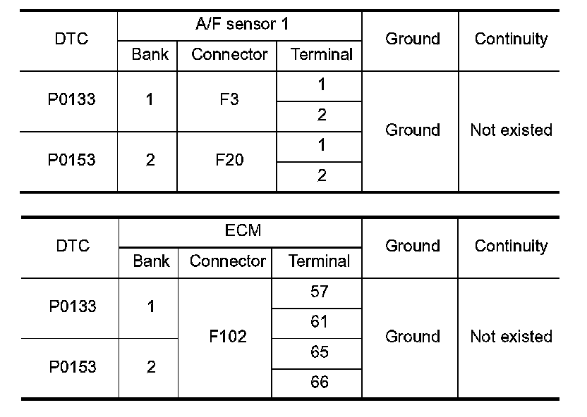 4. Check the continuity between A/F sensor 1 harness connector and ground, or ECM harness connector and ground.