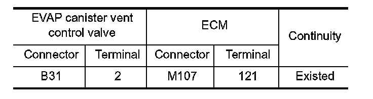 3. Check the continuity between EVAP canister vent control valve harness connector and ECM harness connector.