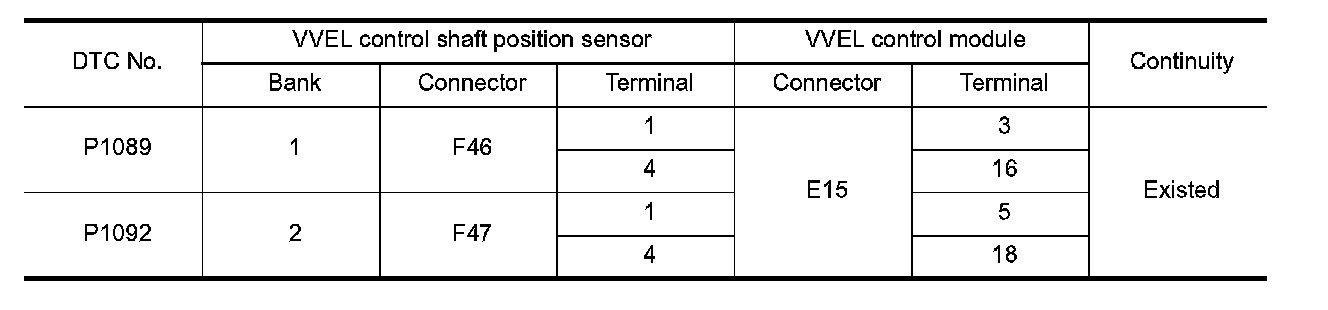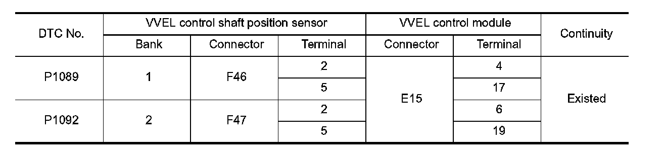 1. Check the continuity between VVEL control shaft position sensor harness connector and VVEL control module harness connector.