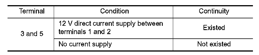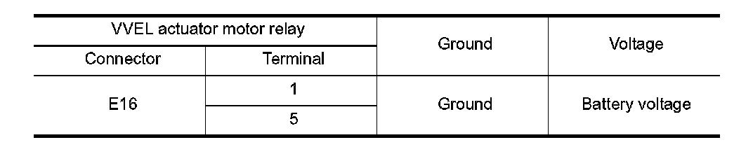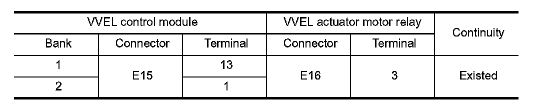 3. Check the continuity between VVEL actuator motor relay terminals under the following conditions.